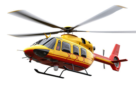 Private helicopter flying in clear blue sky. Business travel transportation, aviation and luxury tourism concept. Commercial chopper