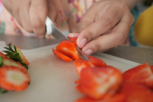 Female slicing strawberries with a kitchen knife in front of fresh strawberries
