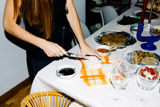 An anonymous woman cutting cheese on a chopping board