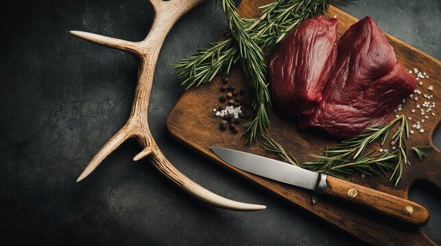 Raw steak meat from roe deer on the bridlic chopping board. Roe deer antler as a decoration. Copy space for text, top view