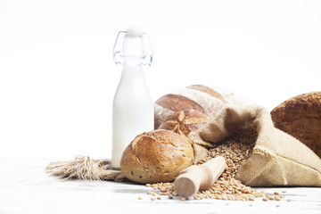 Slicing artisanal bread with butter in cozy kitchen enviroment