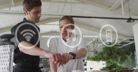 Chef mentoring apprentice chopping onion in pro kitchen with digital icons overlay