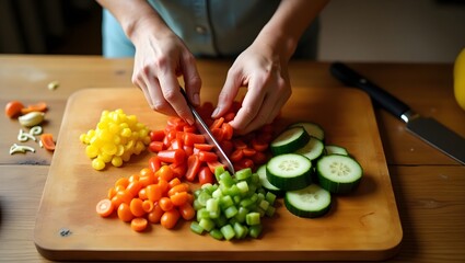 Person carefully arranging colorful chopped vegetables in wooden bowl