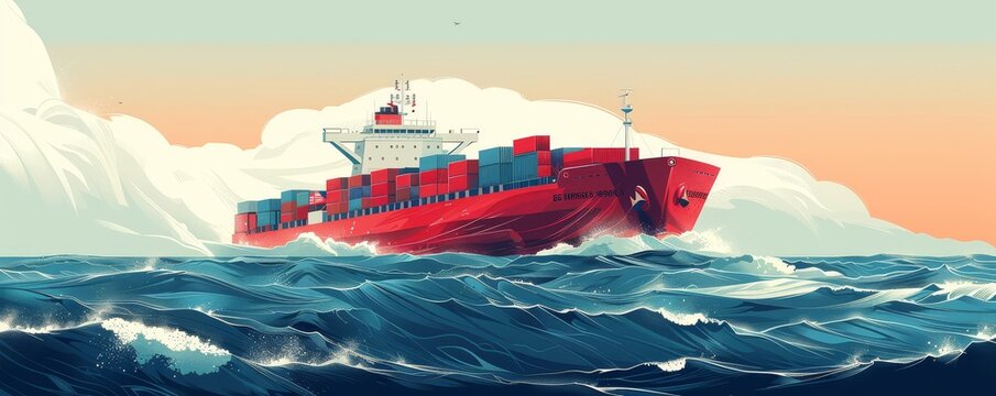 A large red ship is sailing through the ocean. The sky is cloudy and the water is choppy