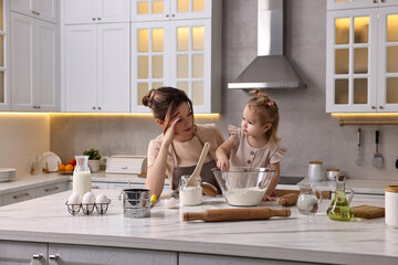 Tired housewife cooking with her little daughter at marble table in kitchen
