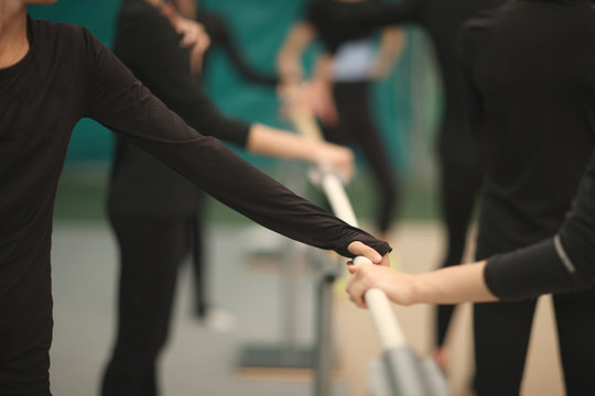 Hands of sportswomen on the choreographic handrail in the rehearsal room