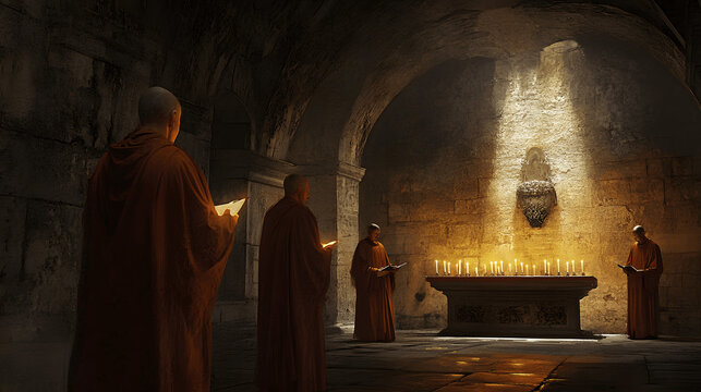 Gregorian monks chanting in monastery with candles glowing on stone walls