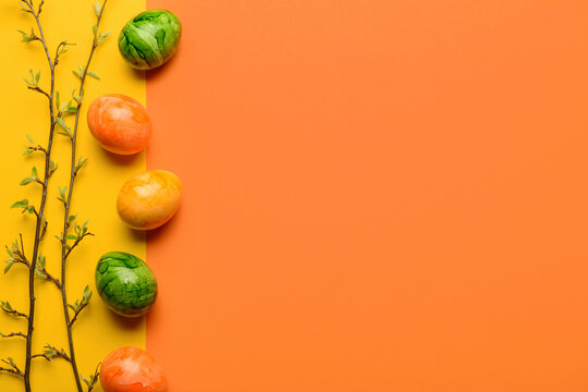 Easter eggs with tree branches on color background
