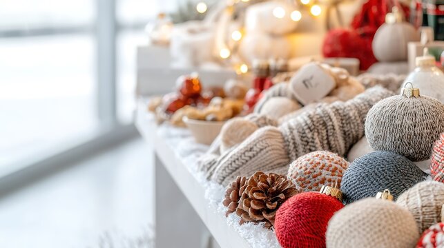 A close-up view of a charming Christmas market stall showcasing an array of artisanal goods, including handwoven scarves, intricate ornaments, and gourmet snacks. The soft glow of string lights