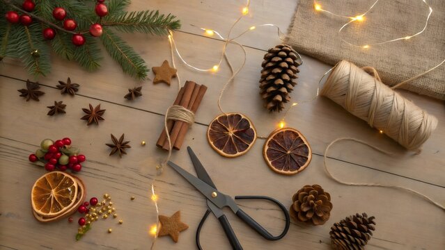 Christmas ornaments, spices, string lights and scissors on a wooden table creating a cozy atmosphere for winter holidays