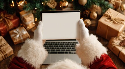 over shoulder view of santa claus holding xmas gift using laptop computer with white blank empty mock up screen monitor for e commerce website ad sitting at decorated table on merry christmas eve no