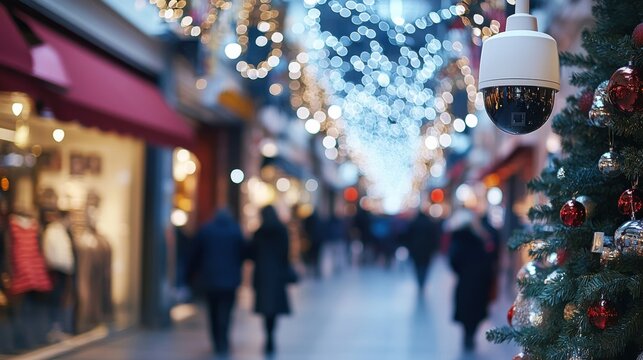 Surveillance camera monitoring a festive shopping street during the holiday season