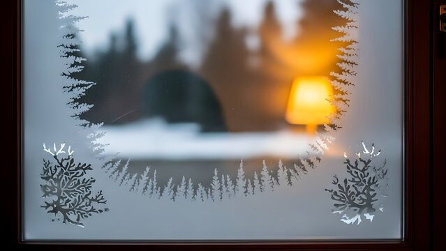 A window pane featuring decorative white frost or decal art in the shape of a winter forest and small trees, obscuring the view of a blurry, warm interior with an illuminated lamp, suggesting a cozy s
