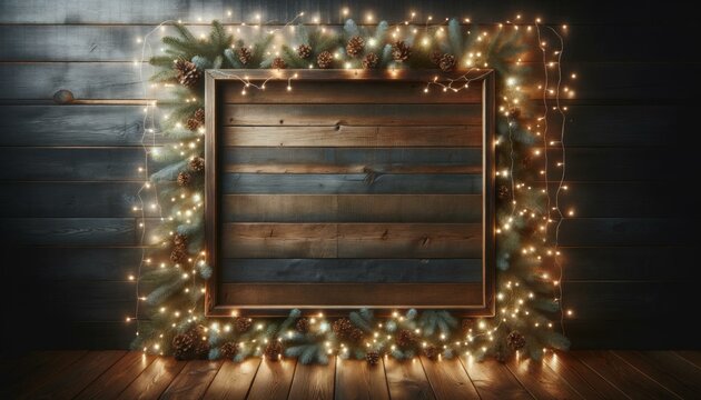 Vintage Wooden Wall Backdrop Illuminated by Draped Christmas Lights with Inviting Blank Center, Xmas Frame