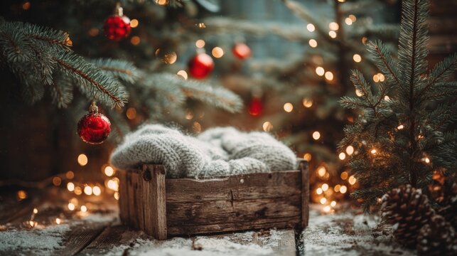 Cozy winter scene with a knit sweater in a wooden crate, surrounded by festive Christmas lights, pine trees, and red ornaments.