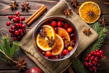 Mulled Wine Ingredients in Pot Top View - Cozy Holiday Drink with Spices, Fruits, and Aromatic Flavors for Festive Celebrations and Seasonal Gatherings