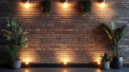 This digital artwork presents a minimalist product stand with vibrant neon accents against a classic brick backdrop, perfect for showcasing items.