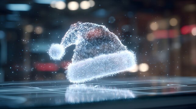 Futuristic holographic Santa hat above a glass workspace with glowing neon accents and soft digital snowfall