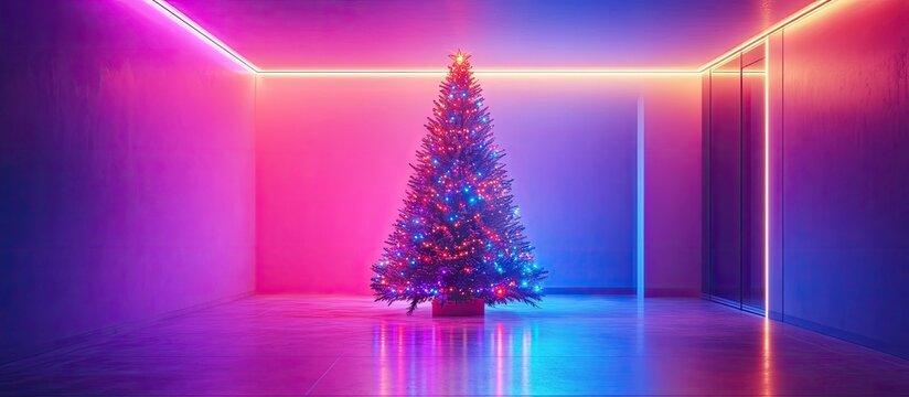 Vibrant Christmas tree illuminated with colorful lights in a modern room with blue and pink neon accents creating a festive and cheerful atmosphere