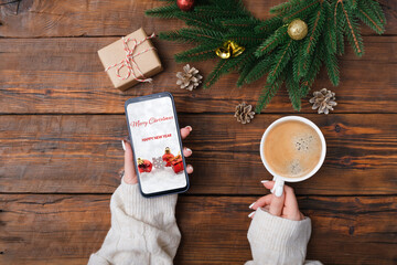 Smartphone with blank screen is in the middle of wood table with christmas decorations. Top view with copy space, flat lay.
