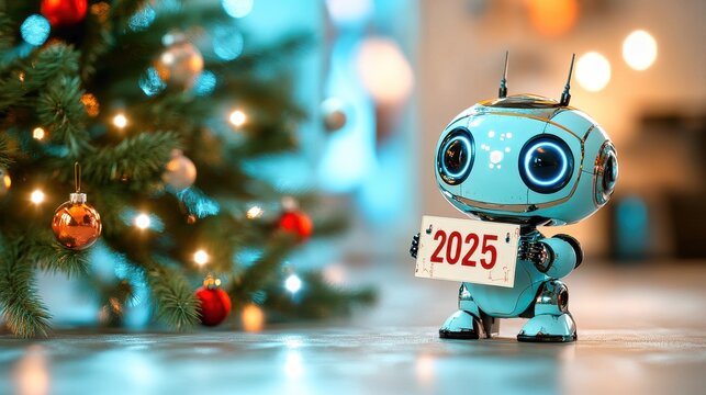 Cute robot is wishing happy new year 2025 near christmas tree