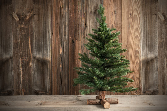 One Green Christmas Tree. Brown Rustic Wooden Background Or Texture With Copy Space