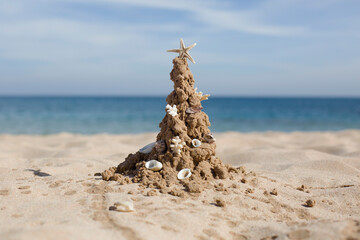Christmas fir pine tree growing in a nursery near forest. Close up shot, shallow depth of field, no people