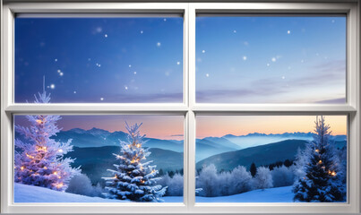 Cozy snowy scene with christmas tree viewed through frosty window