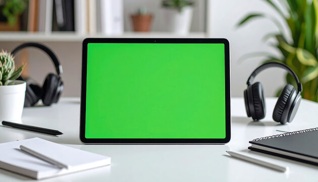 Workplace Tablet Mockup on a White Desk with Green Screen and Accessories, Home Office iPad Chroma Key Template with Headphones and Stationery