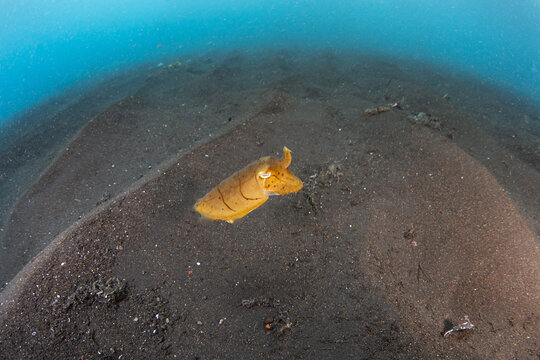 A juvenile Broadclub cuttlefish, Sepia latimanus, hovers over the black sand seafloor in Lembeh Strait, Indonesia. These cephalopods utilize chromatophores and texture to camouflage themselves.