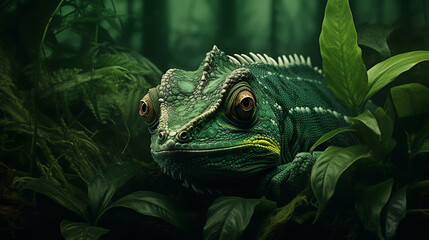 Young Green Chameleon is crawling on the green leaves, Reptile Animal