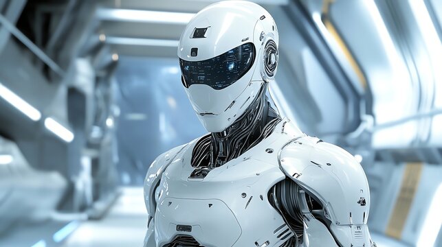 A white humanoid robot in a futuristic environment.