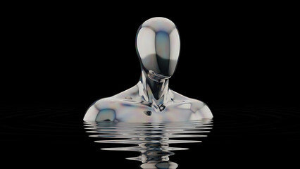 Futuristic 3D render of a polished chrome metallic humanoid bust emerging from dark reflective water ripples on a black background for science fiction and artificial intelligence concepts.