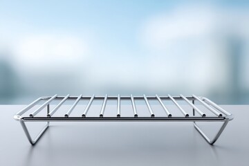 A close-up shot of a shiny, chrome cooling rack placed on a reflective surface against a blue background.