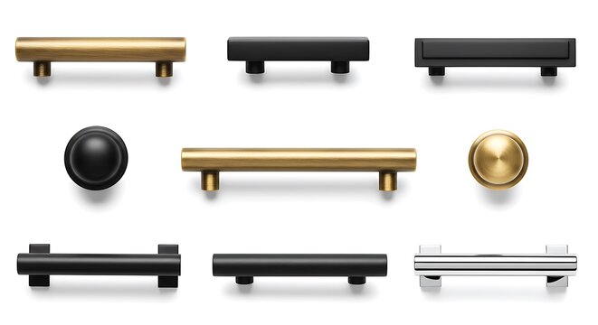 A beautifully arranged collection of modern cabinet and drawer hardware, showcasing a variety of handles, pulls, and knobs.