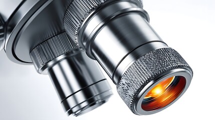view of a microscope with shiny, metallic components, featuring textured focusing knobs and a warm light source within the lens, set against a bright background that showcases scientific equipment.