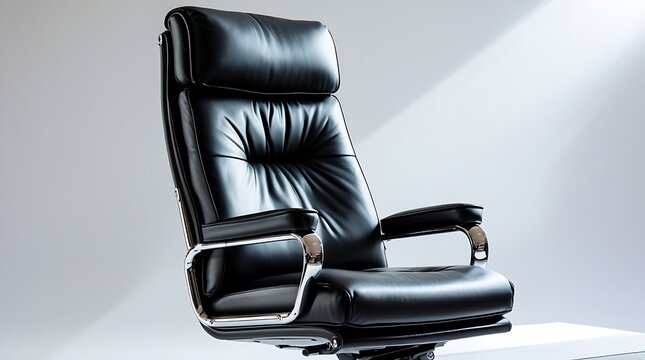 Photo of a luxurious High-back executive chair featuring premium leather upholstery in a rich black color, sleek chrome arm supports, and a padded headrest for optimal comfort.