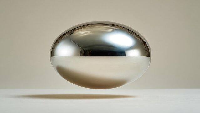 A floating two-tone metallic sphere, chrome top half and matte bottom half, hovering above a pale surface. Concept Futuristic still life, two-tone metallic object, chrome vs matte texture