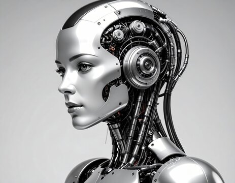 Androïde rétrofuturiste au visage humain – style science-fiction vintage en noir et blanc