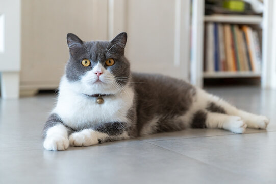 Slight obese, or fat, pussy cat outside in the sunny garden with fresh green grass in spring in the Netherlands