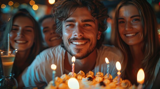 A group of friends gather around a birthday cake, celebrating with a man who is about to blow out the candles