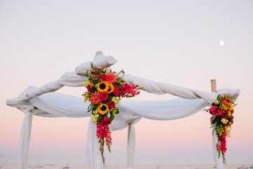 Jewish chuppah with flowers at sunset