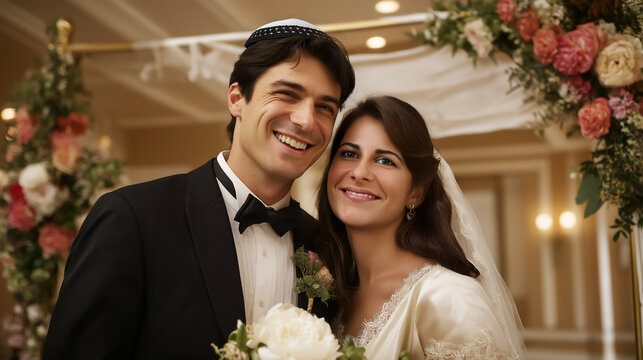 Jewish couple at a marriage ceremony under a floral chuppa wedding canopy. Canopy is inscribed in Hebrew with words from the biblical book Song of Songs: 'I am to my beloved'.