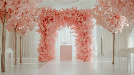 Elegant wedding chuppah with vibrant floral arrangements in a luxurious indoor banquet hall setting for a romantic celebration atmosphere