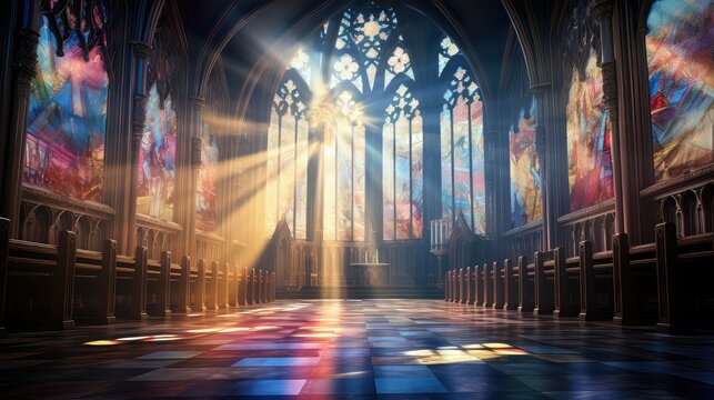 Sunbeams streaming through stained glass window lighting church aisle and dust particles