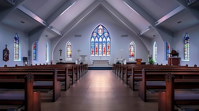 High resolution images Blurred background of an old church interior with stained glass windows and pews, creating a dreamy bokeh effect for the background image. The focus is on capturing the serene