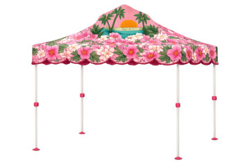 Pink tropical tent featuring hibiscus flowers, palm trees, and sunset for summer beach vacations, transparent background