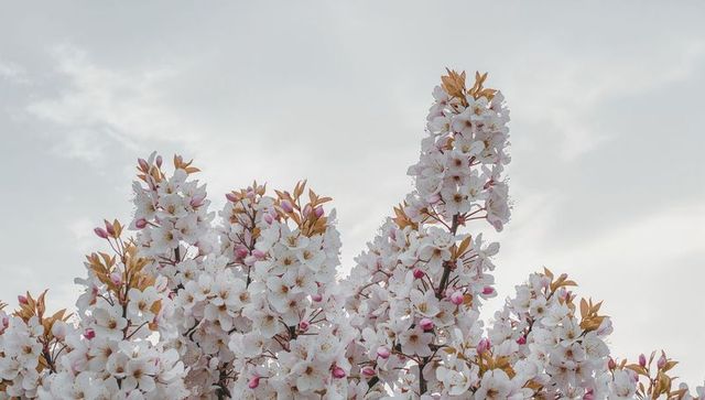 Blooming cherry branches reaching toward soft overcast sky