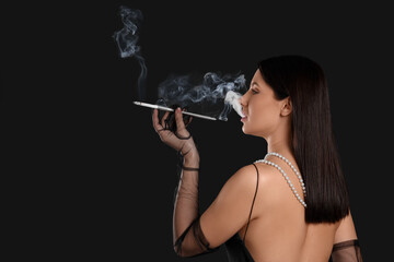Woman using long cigarette holder for smoking while talking on phone against black background, space for text