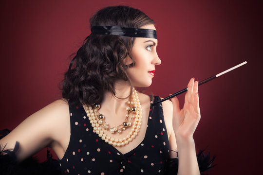 Beautiful girl with smoky eyes and red lips holding cigarette